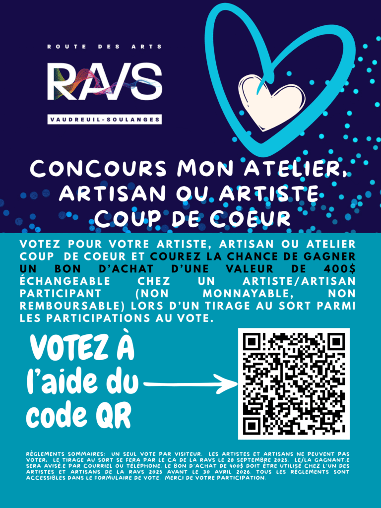 La Route des arts de Vaudreuil-Soulanges (RAVS) présente un parcours de découvertes culturelles offrant au public l’opportunité de visiter plusieurs ateliers d’artisans et artistes tout en sillonnant les routes de la région de Vaudreuil-Soulanges. Cette année l’événement a eu lieu les 20 et 21 septembre 2025, Nous annoncerons les dates pour 2026 sous peu. Nous organisons également une variété d’activités culturelles permettant aux artisans et artistes de la région de participer aux expositions collectives, de donner des ateliers et plus encore…